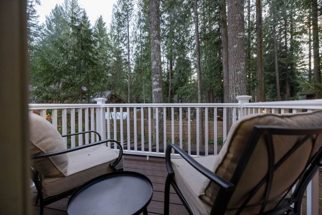 Step outside to relax in the private hot tub, ideal for soaking under the stars while enjoying the fresh mountain air. The upper balcony offers a peaceful spot for morning coffee or meals overlooking the wooded surroundings. The backyard is spacious and surrounded by trees, with outdoor dining and a BBQ. Plans for this spring include fully fencing the backyard and adding a firepit for cozy evening gatherings.