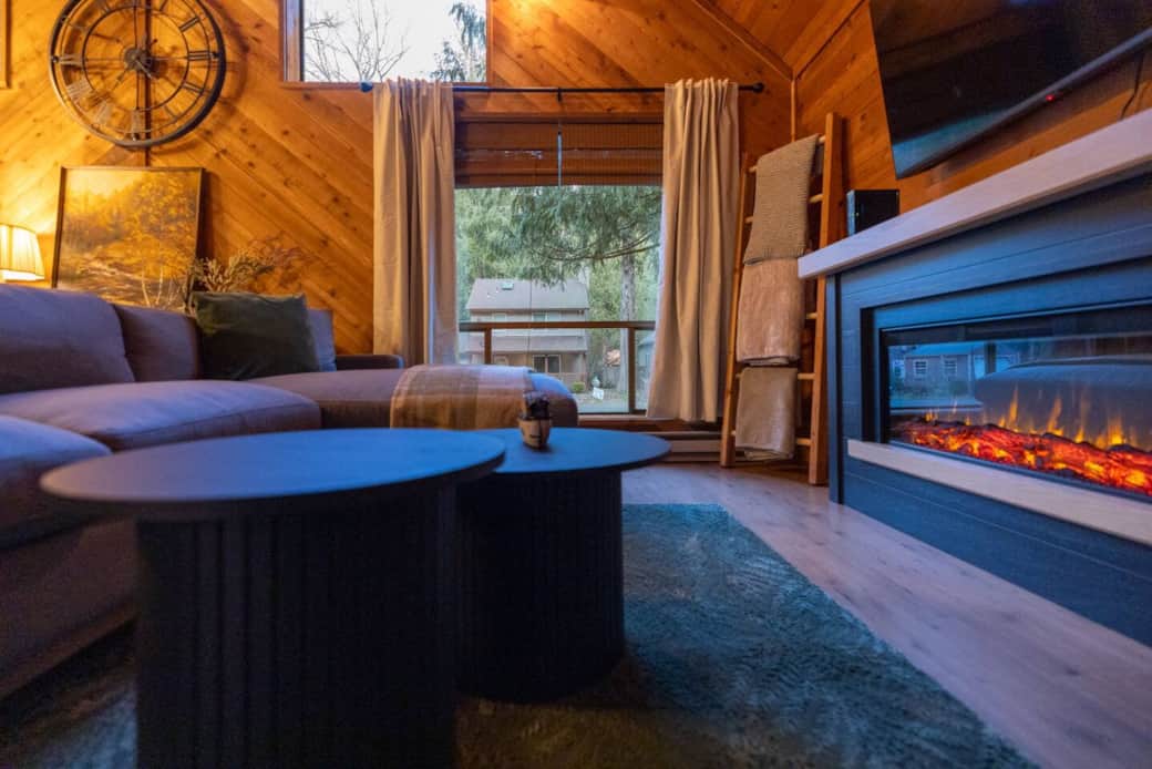 The open-concept living area offers a relaxed, home-away-from-home atmosphere—perfect for spending quality time together. The fully equipped kitchen features modern appliances, a double oven, and a gas fireplace.